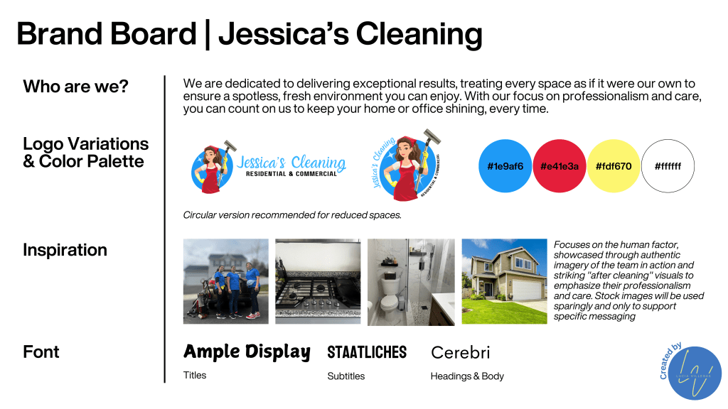 Jessica’s Cleaning had an existing logo that lacked consistent application and brand-defined colors, making it challenging to establish a professional and memorable identity. To address this, we followed a three-step process: