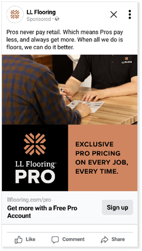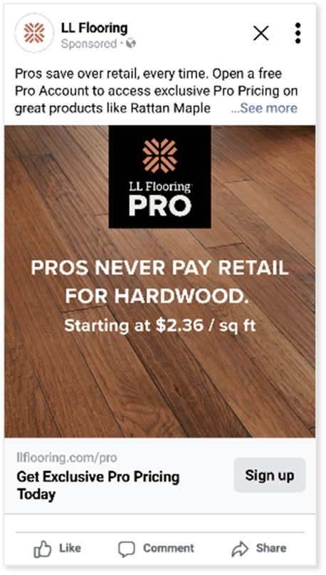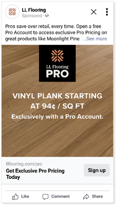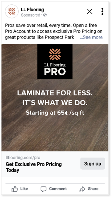 In my role at LL Flooring, I launched an omni-channel paid media campaign, featuring a new value proposition and new branding, that targeted with Pro Customers (floor installers, restoration companies, property managers, construction companies, etc.), leading to a 35% increase in customer signups to the Pro Program in less than 3 months after launch.